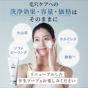 液体と固形ソープのメリットを掛け合わせ、保湿成分をたっぷり含みながらも高い洗浄力をあわせ持つ半生タイプのソープです。火山灰・ホルミシス・ソフトピール成分・酵素を配合し多角的に毛穴へとアプローチ。洗浄剤の肌残り負担まで計算されたテクスチャーですっきりとした洗い上がりに。